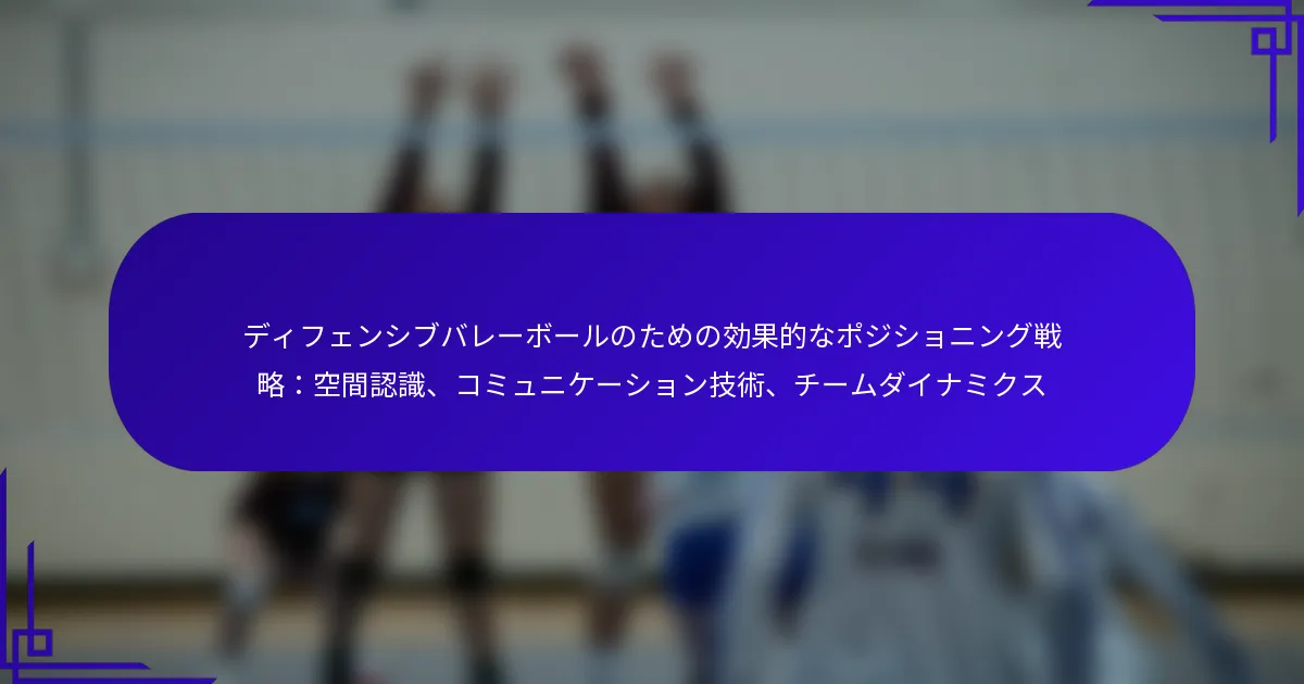 ディフェンシブバレーボールにおける効果的なポジショニング戦略は、空間認識、コミュニケーション技術、強力なチームダイナミクスに依存しています。コートのポジショニングをマスターし、相手の動きを予測することで、選手は防御の効果を大幅に向上させることができます。チームメイト間の明確なコミュニケーションは、調整力と反応力を育み、まとまりのあるチームダイナミクスは試合中の全体的なパフォーマンスをさらに高めます。