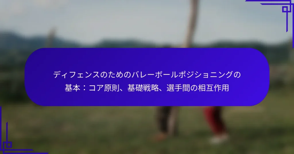 バレーボールにおける守備位置の基本を理解することは、強力なチームディフェンスを構築するために不可欠です。効果的なコミュニケーション、適切なスペーシング、相手の動きを予測することといった重要な原則は、選手がさまざまな攻撃スタイルに適応するのを可能にします。チームメイト間の信頼と協調を育むことで、チームは守備戦略を強化し、コート上での全体的なパフォーマンスを向上させることができます。 バレーボールの守備位置の核心原則とは? バレーボールの守備位置の核心原則は、効果的なコミュニケーション、相手の戦略を理解すること、プレーを予測することに焦点を当てています。これらの要素は、さまざまな攻撃スタイルや選手の傾向に適応できる一貫したディフェンスを作り出すために不可欠です。 選手間のコミュニケーションの重要性 効果的なコミュニケーションは、バレーボールにおける成功した守備戦略にとって不可欠です。選手は、ボールの位置、相手のヒッター、そして自分の位置について常に情報を共有しなければなりません。これにより、全員が自分の役割を認識し、変化する状況に迅速に反応できるようになります。 明確な合図や口頭の合図を使用することで、速いペースのプレー中の混乱を最小限に抑えることができます。たとえば、選手がボールを取るつもりのときに「マイン」と叫ぶことで衝突を防ぎ、スムーズな移行を確保できます。コミュニケーション戦略を話し合うための定期的なチームミーティングは、この守備の側面をさらに強化することができます。 相手の攻撃パターンを理解すること 相手の攻撃パターンを分析することで、ディフェンダーはプレーを予測し、効果的にポジショニングすることができます。チームは、相手が攻撃する際の傾向を特定するために、以前の試合を研究するべきです。たとえば、好まれるヒッティングアングルや特定の選手の傾向などです。この知識は、守備戦略やフォーメーションに役立ちます。 たとえば、ヒッターが常にバックローを狙う場合、ディフェンダーはそのエリアをより効果的にカバーするためにポジショニングを調整できます。相手のウォームアップを観察することも、彼らの好ましいショットや戦略についての洞察を提供し、ディフェンダーがそれに応じて準備することを可能にします。 守備における予測の役割 予測は、ディフェンシブプレーヤーにとって重要なスキルであり、攻撃に迅速に反応することを可能にします。ヒッターのアプローチやボディランゲージに基づいてボールがどこに行くかを予測することで、ディフェンダーはより効果的にポジショニングできます。これには練習とゲームの深い理解が必要です。 選手は、ヒッターの動き、たとえば足の動きや肩の位置を読み取ることに焦点を当て、彼らの意図するショットを把握する必要があります。このスキルを発展させることで、チームの守備効果が大幅に向上し、選手がプレー中により迅速で情報に基づいた決定を下すことができるようになります。 ヒッターを効果的に読むこと ヒッターを読むことは、彼らのボディランゲージやテクニックを観察して次の動きを予測することを含みます。ディフェンダーは、ヒッターのアプローチ、アームスイング、目の方向に注意を払う必要があります。これらの合図は、ボールがどこに行くかを示す可能性があります。このスキルは、練習やゲーム経験を通じて発展させることができます。 たとえば、ヒッターが攻撃する前に常に左側を見ている場合、ディフェンダーはそれに応じてポジショニングを調整できます。ヒッターを読むことに焦点を当てた定期的なドリルは、選手がこの能力を磨くのに役立ち、最終的には試合中のより良い守備位置につながります。 守備フォーメーションとその応用 一般的な守備フォーメーションには、ペリメーターディフェンス、ローテーションディフェンス、6-2システムがあります。各フォーメーションにはそれぞれの強みがあり、異なるプレースタイルに適しています。各フォーメーションを実施するタイミングを理解することが、効果的なディフェンスの鍵です。 ペリメーターディフェンス:バックローをカバーすることに焦点を当て、強力なヒッターを持つチームに対して理想的です。 ローテーションディフェンス:選手がポジションをローテーションする際に迅速な調整を可能にし、多才な攻撃者を持つチームに役立ちます。 6-2システム:2人のセッターを含み、攻撃の圧力を維持しながら堅固なディフェンスを確保するのに効果的です。 チームはこれらのフォーメーションを定期的に練習し、選手が快適に感じ、相手のスタイルに適応できるようにするべきです。相手の傾向に基づいてフォーメーションを調整することで、守備の効果を高め、チーム全体のパフォーマンスを向上させることができます。 守備位置を改善するための基礎戦略とは? バレーボー